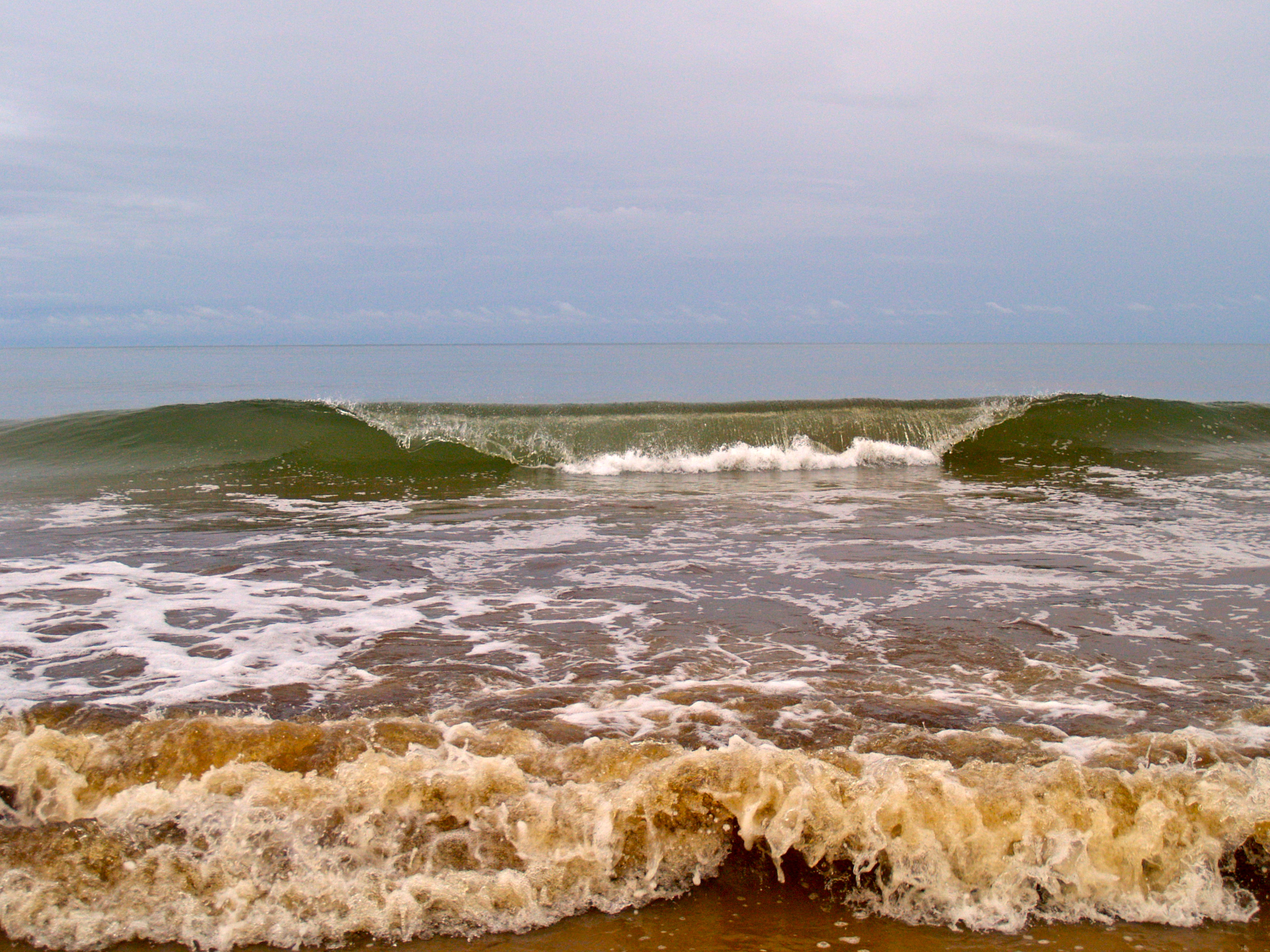Lagoa Salgado is a large permanent lagoon close to Canto Verde. The lagoon is now greatly swollen and many new lagoons have formed around it, some are incredibly deep, great fun to play in, but extremely dangerous for the large number of children who are drawn to them. The waters pouring out of these lagoons, have formed a wide river, the silt laden flood water carves its way to the sea, cutting a deep gouge across the beach. Yesterday, in the weak, watery sunshine the sea was a flat dull grey. The heavy waves turned aquamarine as they broke, glistening bronze where the sea water mixed with that from the river.