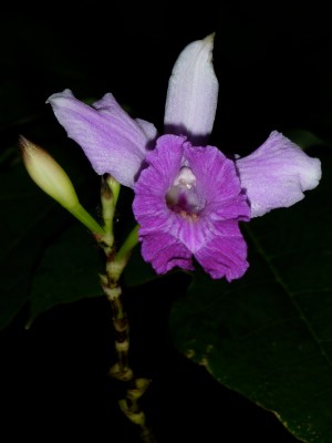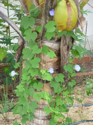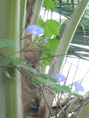 I love the blue of this flower, late afternoon the flower changes to a deep pink. There is another plant here that has similar flowers but they are always pink, the people here call it Salsa, I’m told this is another type. It looks like what in England we call Morning Glory, though I’m not sure the leaves are the same. Here it is growing up one of our coconut trees.
