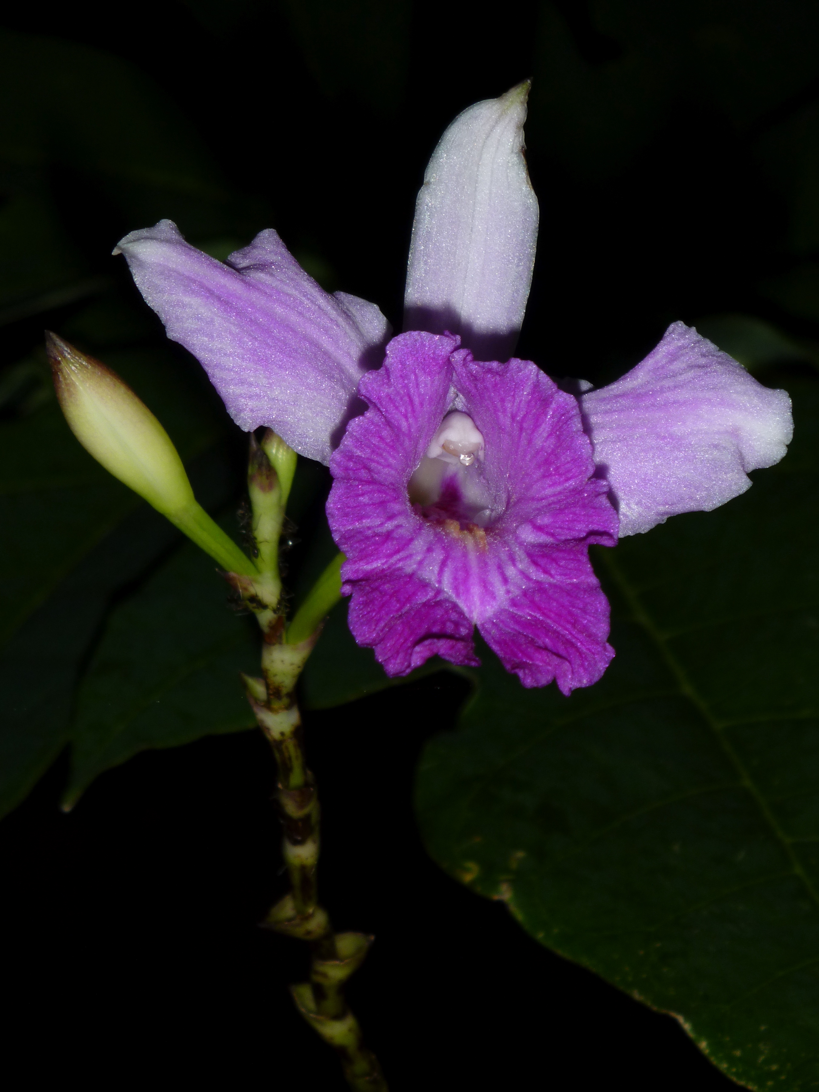 This is a bamboo orchid. I took the photo at night with only the outside light illuminating it.