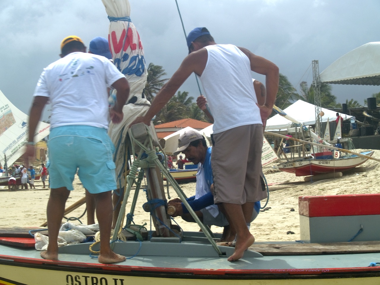 On the morning of the regatta, it seemed to me that where ever I pointed my camera, Zé would be there, hammering, sawing or measuring something. One photo I missed was him wielding a sledge hammer on the mast housing of a large jangada, he hit the wooden block with such force I expected to see it explode, needless to say it didn’t. Later as the jangadas were lining up for the start, I was astonished to see Zé was making up part of a crew, he must have been shattered and he later told Neu that the regatta had nearly killed him but his boat came in 4th, a good enough position for Zé to collect a trophy, fabulous he’d certainly earned it.