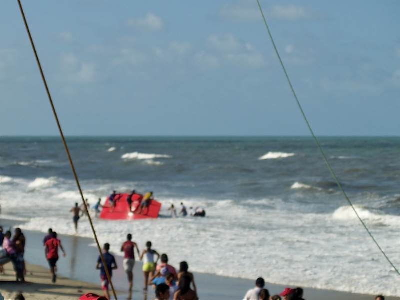 During the award ceremony there was a moment of drama. A jangada from a neighbouring community was setting off to return home, the jangada was heavily overladen with people, non of them in life jackets. As the boat was going through the surf, it was hit by a wave and overturned, throwing all the passengers into the water. Fortunately there were several people at the point on the beach where the accident happened and they rushed to help, one young man from Prainha spotted a woman floating face down in the water, she had been hit on the head as the boat went over and knocked unconscious, the young man pulled her from the water and she was taken to hospital. Thankfully she suffered no lasting harm but it was a stark example of the risks of going to sea without taking proper caution. The captain of the boat received a serious warning from the Navy and the commander ordered the jangada to be left in Prainha, the crew would have to return at a later date to collect.