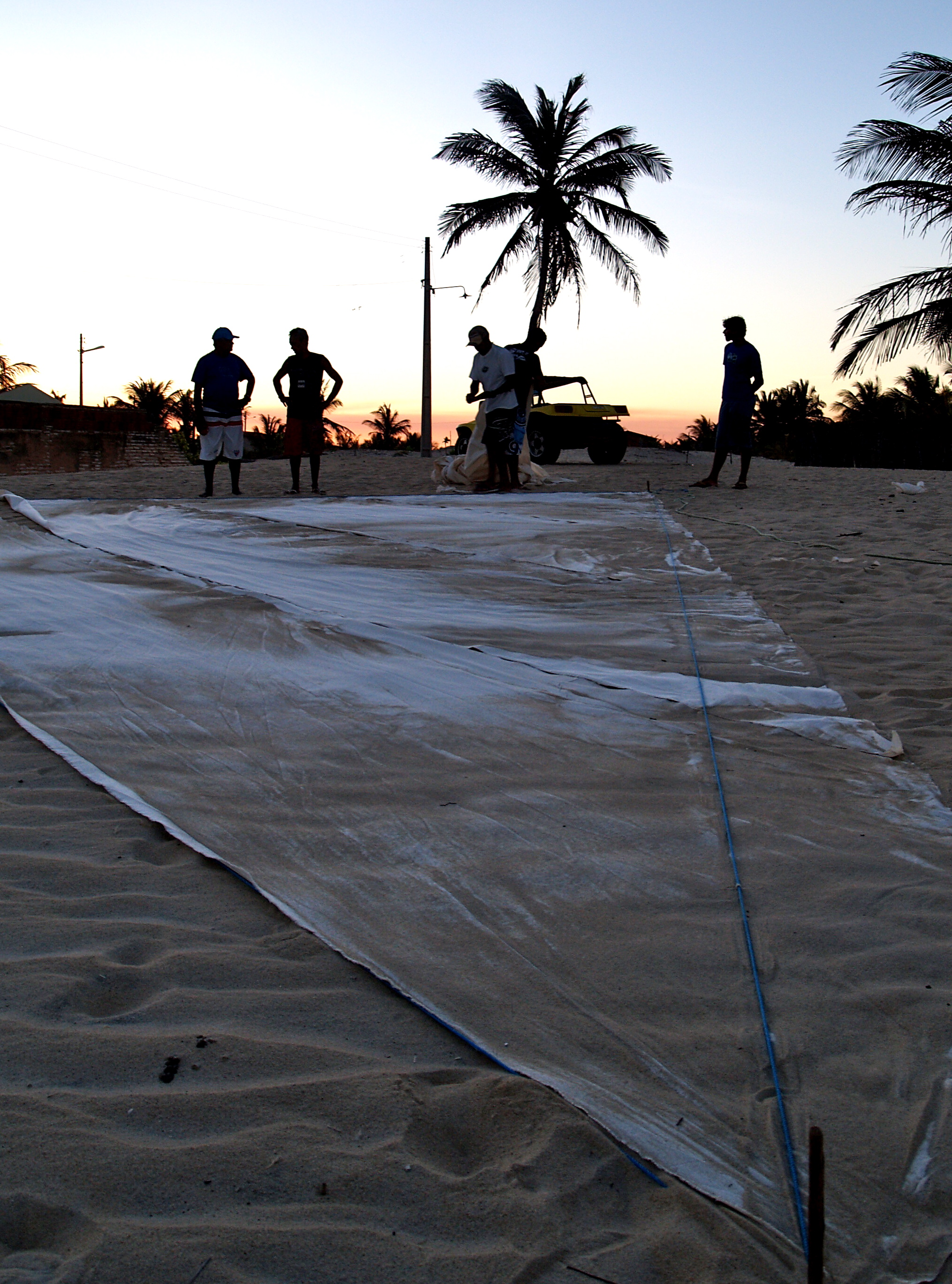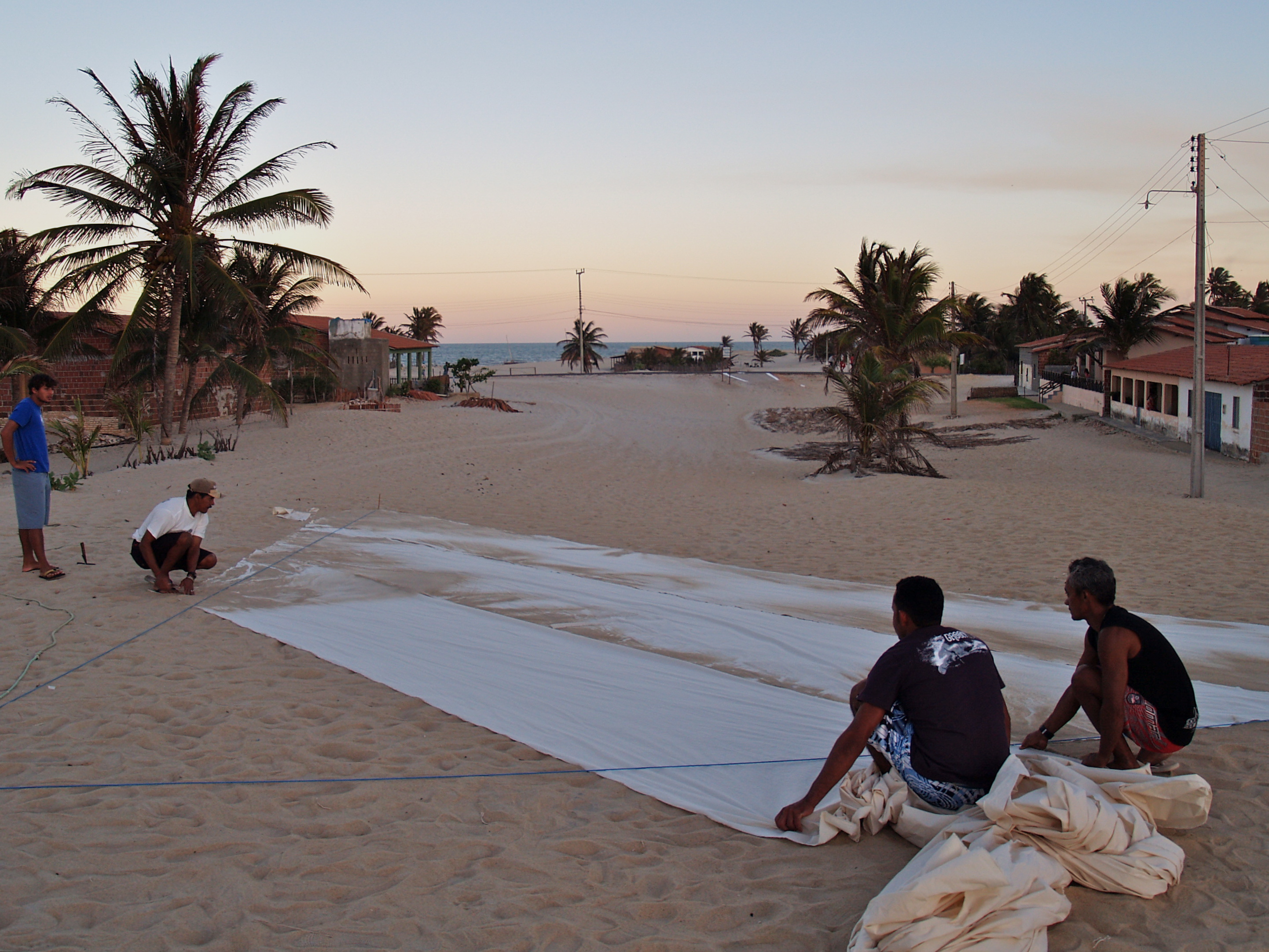 You may be familiar with the “Where’s Wally” books, I’m tempted to create a photographic series with a similar theme. There is a man here called Zé, he is a fisherman but also works on building and repairing jangadas. On the weeks leading up to the regatta he is always working flat out, someone is always looking for him and quite how he manages to get around to everyone is a bit of a mystery. Zé cuts many of the sails here and I have often seen him in the last fading light of the day, laying out meters of sail cloth on the sand, to be cut with a knife into the required shape, ready for the pieces to be stitched together.