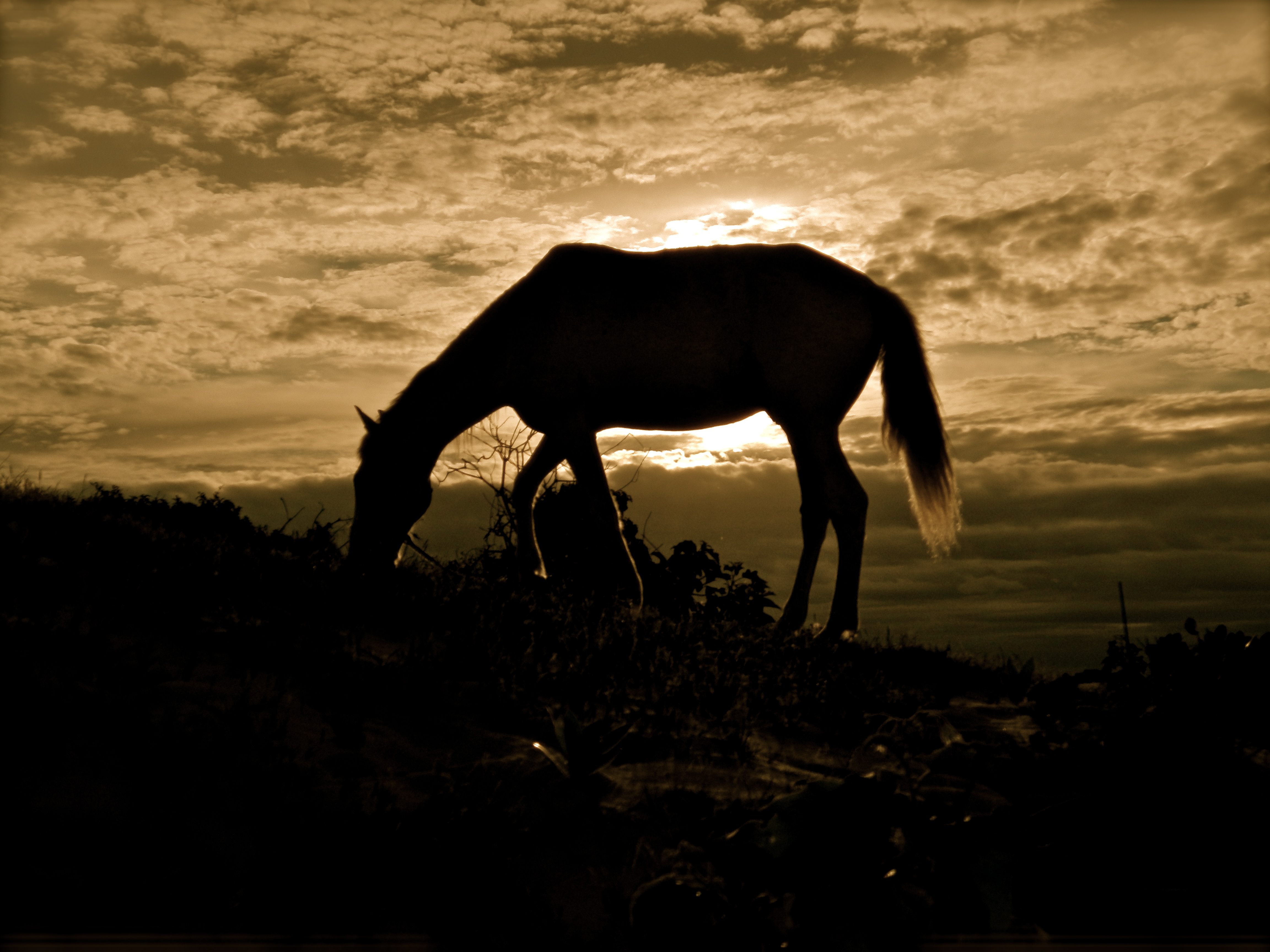It was a very strange moment. My dogs who are normally keen to bark at anything that moves, stood stock still. The lead horse was eyeing us suspiciously, his ears twitching back and forth, Mister was breathing hard down his nose, some of the horses tugged at strands of the sparse wiry grass that covers the dunes, acting unconcerned but keeping a sharp eye on everything, while the younger horses skitting about anxiously. It felt like a stand off in a Cowboy Western.