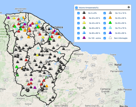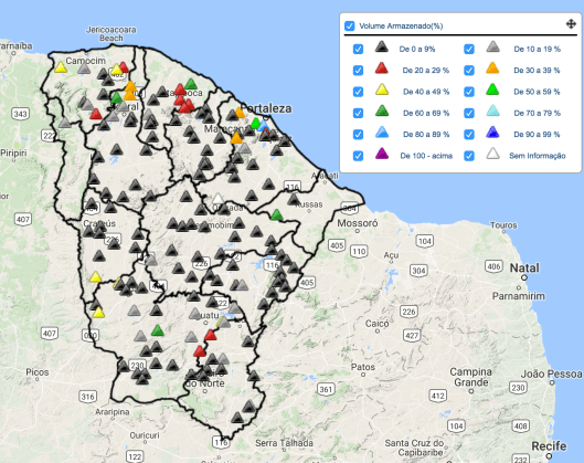The North East region of Brazil has experienced drought conditions for the last 5 years and while a few reservoirs are now full or back to an acceptable level, the vast majority remain under 30% capacity, so there is still some way to go before we are out of the woods as the following two images from Portal Hidrológico Do Ceará show.