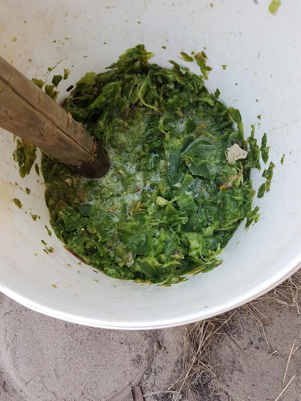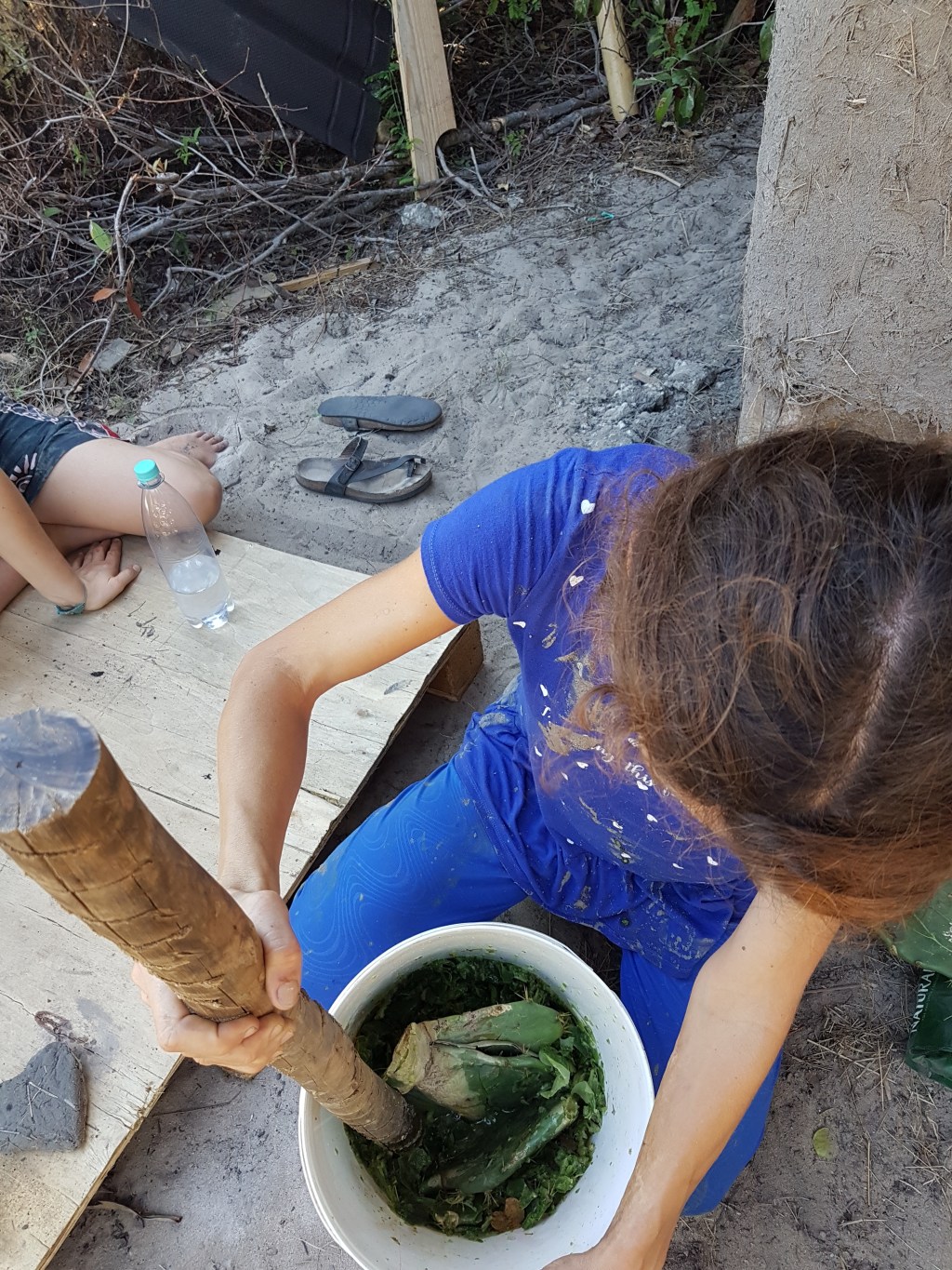Then Martina had us mashing cactus. This type of cactus grows everywhere here and has particularly vicious spines which, if you are unlucky enough to get stabbed by, can quickly become infected. The resulting mash, the juice and the plant pieces, would be painted on the walls. As it dried, the solid pieces would fall away, leaving a water resistant but breathable layer. For extra protection the cactus mash can be applied a few days after a coating with the lime mix.