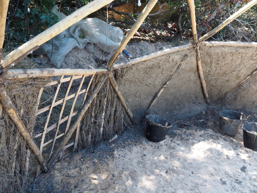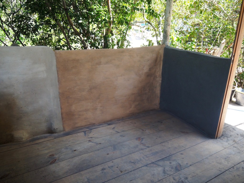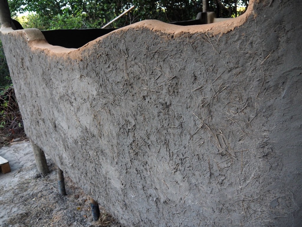 We would be working on two separate structures, using different bio-construction techniques on each. The first, a timber framed structure which will eventually become a craft shop, had previously constructed low Cob* walls. We would add smooth, plaster like layers to the Cob walls and then give them a water resistant coating.