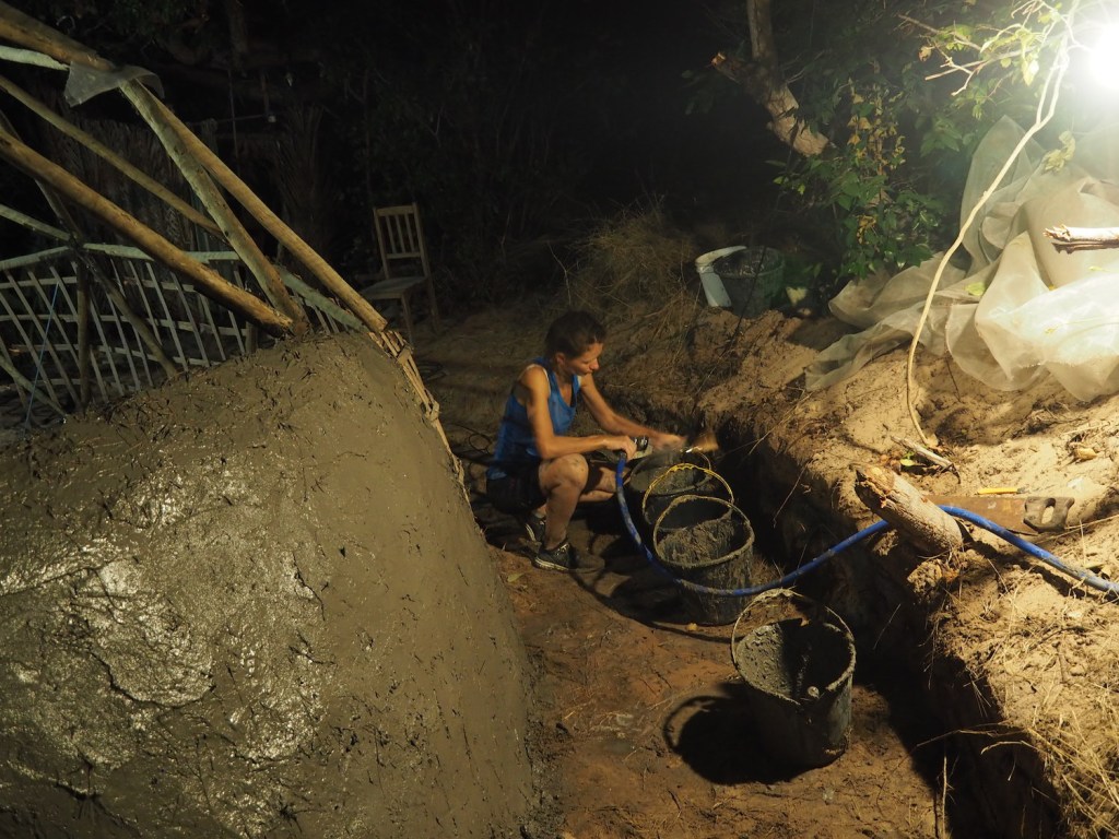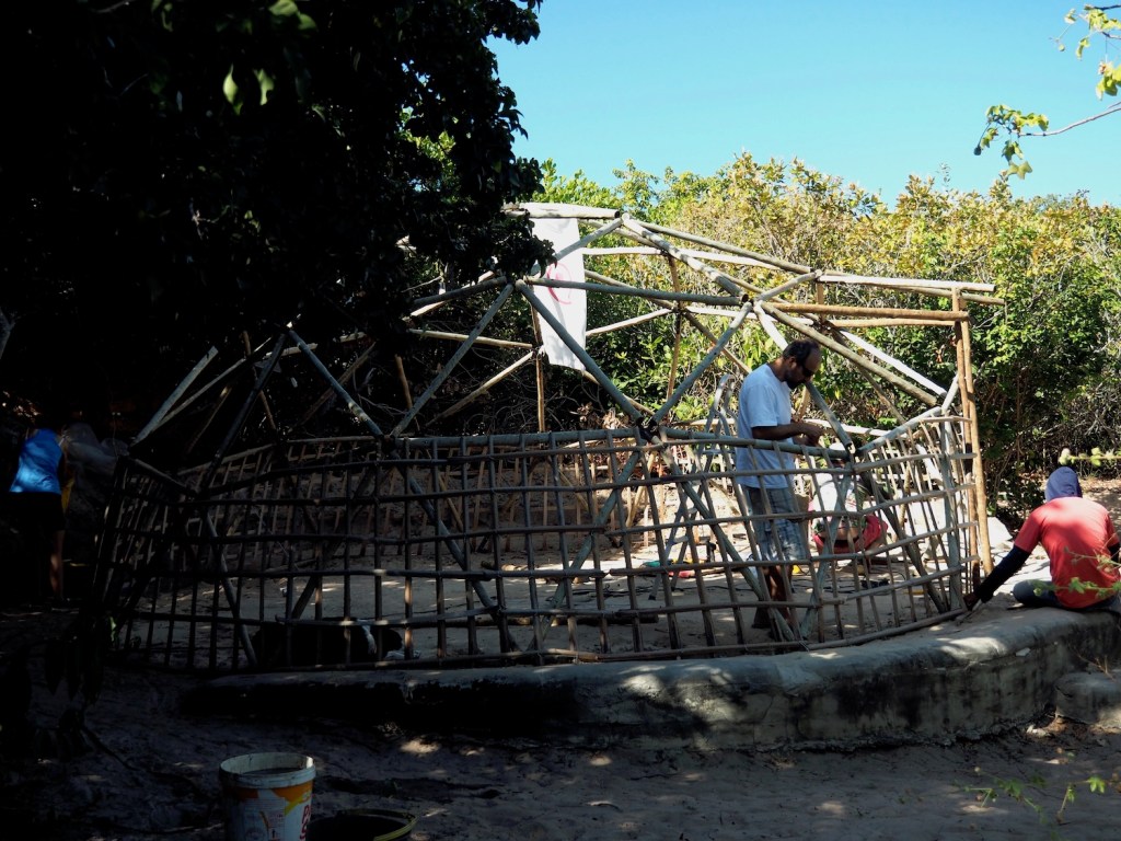 Over the next couple of days we filled in more and more of the lattice. We had to take a break during the hottest part of the day, working into the cooler night for as long as we could bear the mosquitoes, but there were not enough of us to complete the wall in the time I was there, which was a shame. Fabió runs permaculture courses and when he does, those students will also work on the dome and I hope to go back to do some more work on it soon.