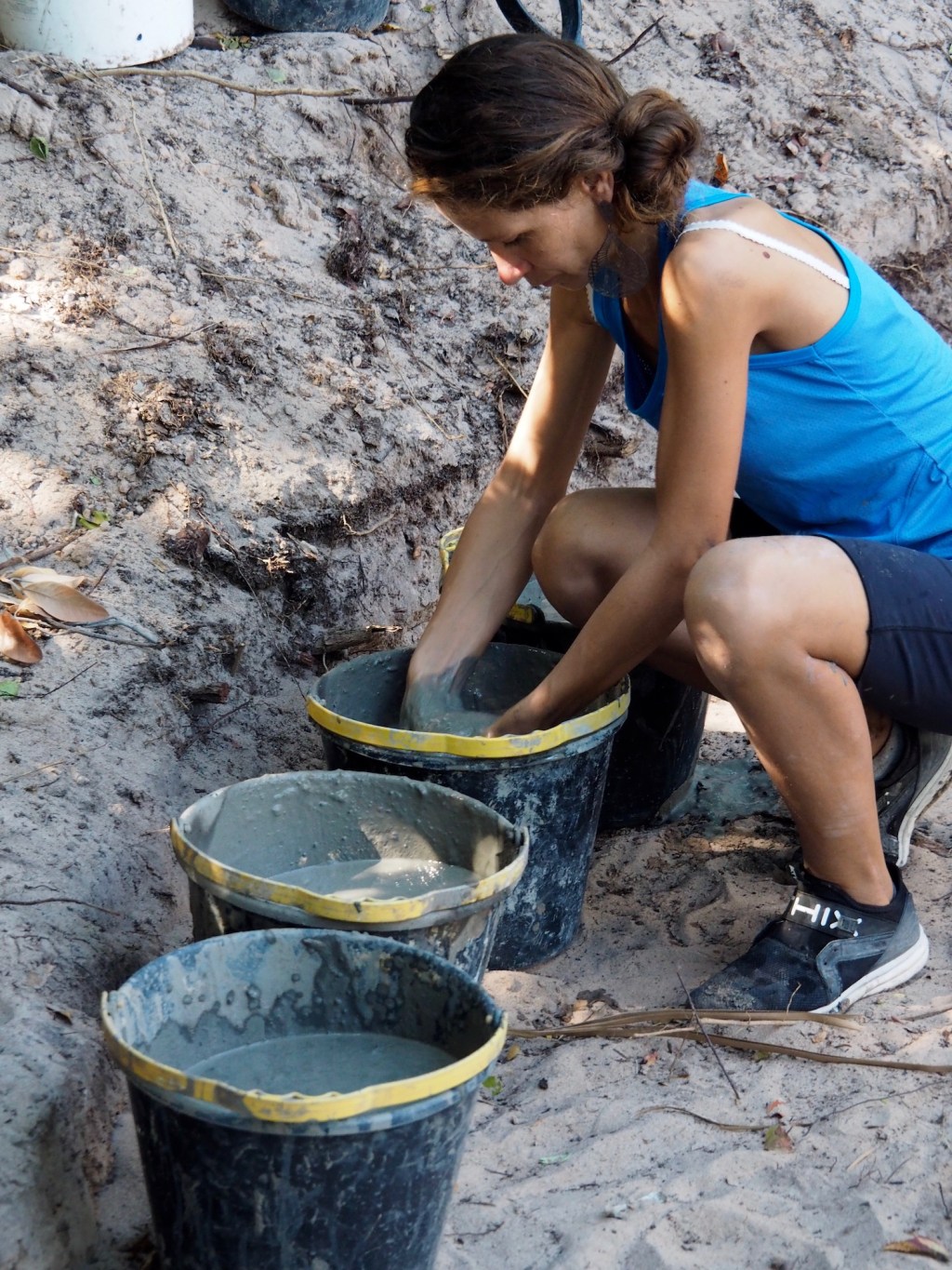 The best mix for natural building methods using clay, sand and straw are location specific, with variations in clay, sand and climate dictating the percentage of each material used. Martina gave us three site specific recipes, to be used one after the other for building the wall. The main difference in these was the length of the cut straw in each mix.
