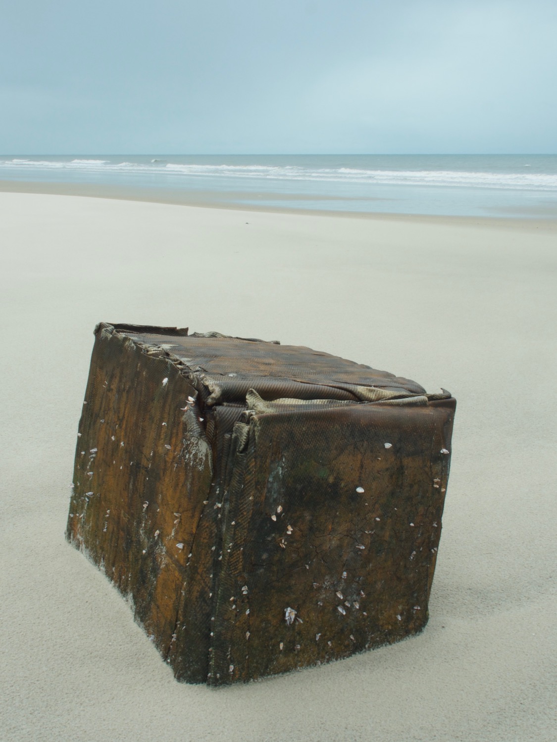 The bales began washing up on beaches in late February 2019. Most were unmarked but I found a single bale stamped with “PRYE ESTATE” stamped into it. An internet search revealed that this was a coconut and rubber plantation in Penang, Malaysia, which began before the 1870s and ended sometime before 1967 when the land was sold off.