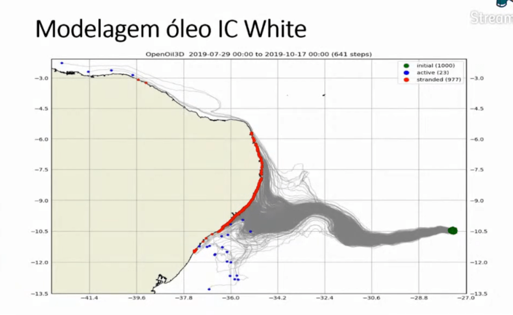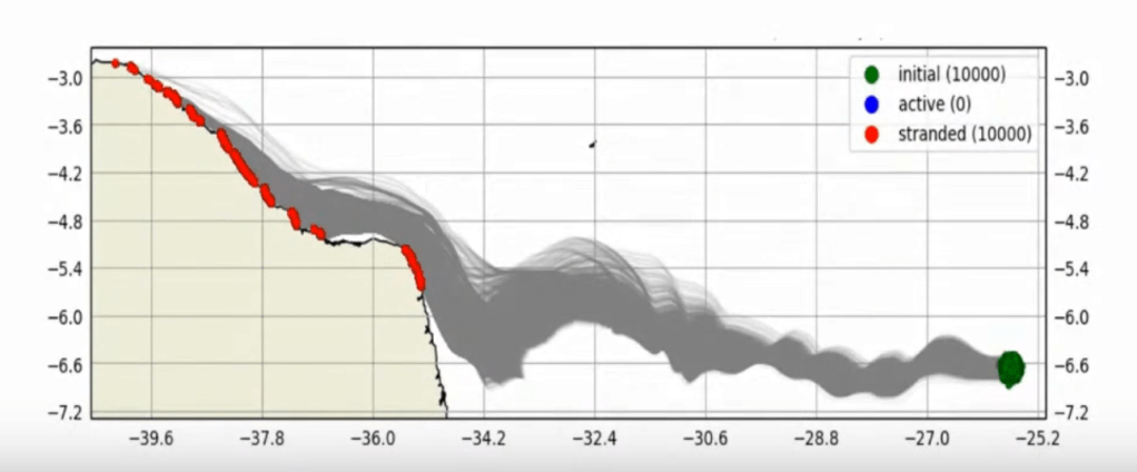 The LABOMAR Professors made a mathematical model for the direction of travel of bales coming from the ship and the result was a perfect match for the location of the bales on the beaches of the NorthEast coast of Brazil.