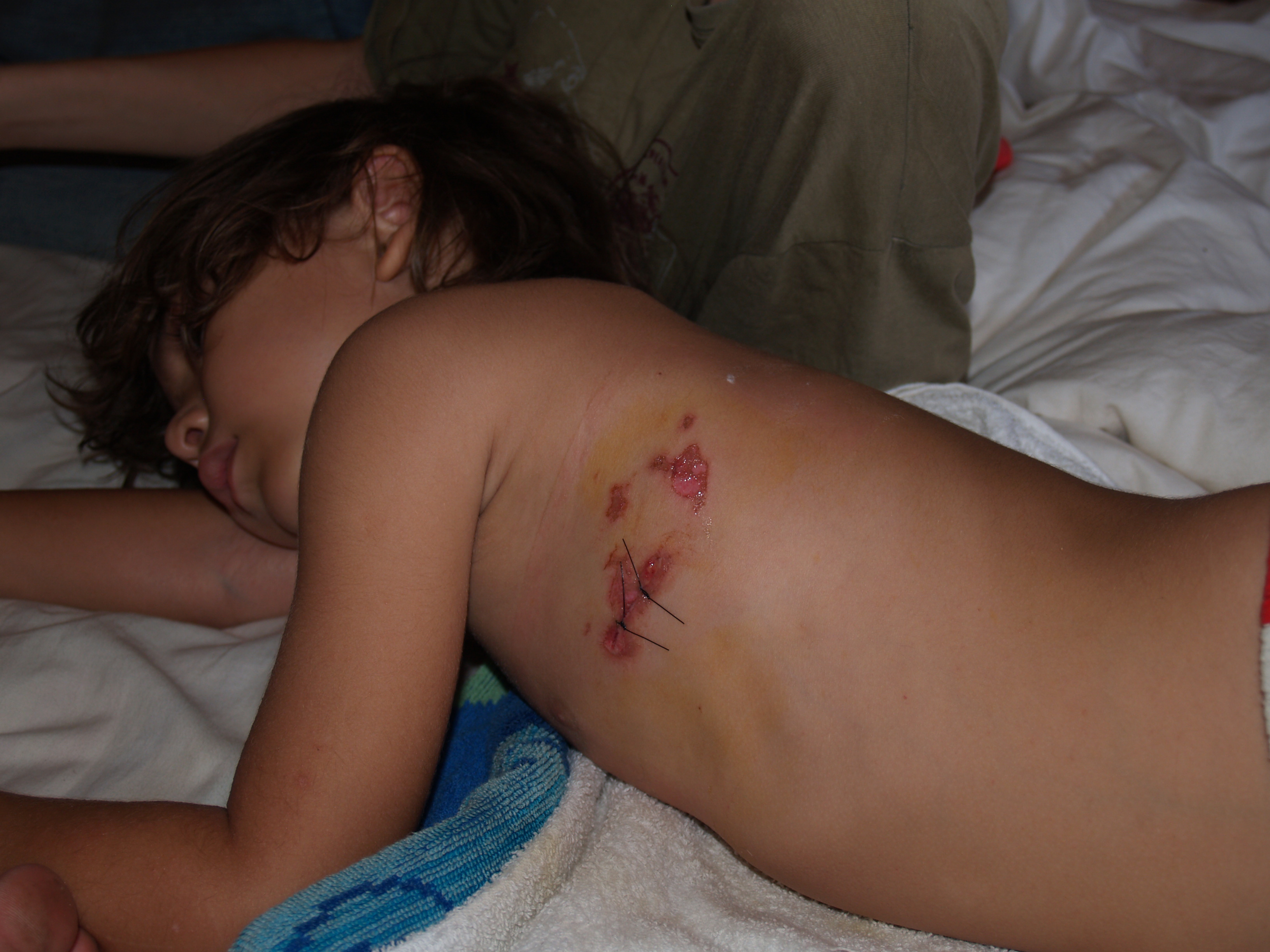 Late Monday afternoon, my four year old son Luan, asked if he could visit his Grandparents who live next door. He had only been gone about 15 minutes when I heard a sudden commotion and then Luan crying. I could tell by his cry that something serious had happened. As I came out of our front door, I could see Luan being carried by his Grandmother (no easy task for her as she walks with a stick), she was calling for me in a most distressed way. When I reached her she was so agitated, I couldn’t understand her rapid Portuguese, what she was trying to tell me? Then I heard her say their dogs name and I knew Luan had been bitten but I couldn’t see where. Poor little Luan was whimpering, covered in his own pooh and obviously going into shock. As I took him from her, I was asking her where he had been bitten but she was becoming more and more hysterical and just kept saying “Oh my God” over and over and how her husband was going to kill the dog.